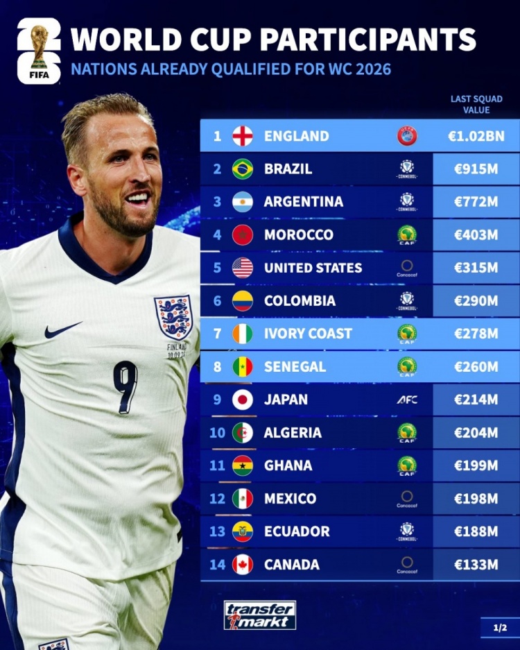 根据最近的统计,德国转会市场对明年世界杯资格球队的身价进行了详细的排名。榜单显示,英格兰队以惊人的10.2亿欧元荣登第一,这笔资金不仅彰显了英超联赛的豪华阵容,也反映了英格兰足球的蓬勃发展。紧随其后的是南美的两大足球强国:巴西和阿根廷,分别以9.15亿欧元和7.72亿欧元的身价位列第二和第三。