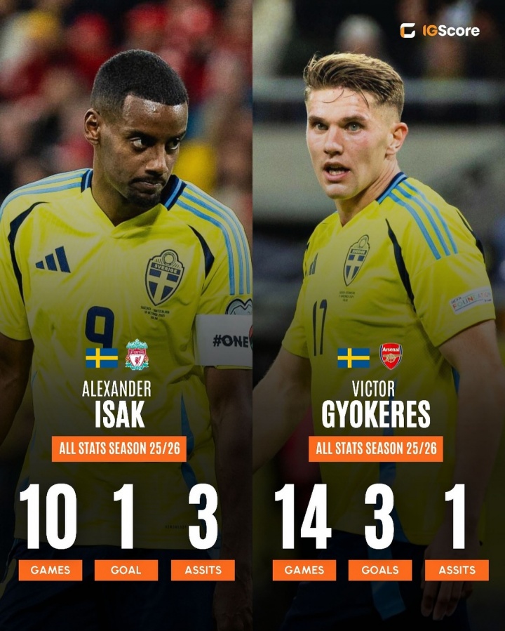 在本赛季中,约克雷斯已为阿森纳和瑞典国家队出战14场,在此期间贡献了3个进球和1次助攻,他目前的转会市场身价为7500万欧元。相比之下,伊萨克则在为利物浦和瑞典出战的10场比赛中,仅打入1球,并送出3次助攻,他的身价已经上升至1.2亿欧元。