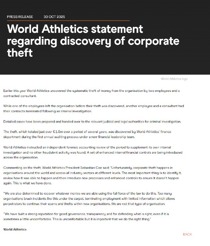10月31日讯,世界田联近日发布了一则重要消息,指出其内部发生了一起系统性盗窃事件,涉及了两名员工与一名签约顾问,总金额超过150万欧元。早在今年初,世界田径联合会就揭露了这起事件,令人震惊的是其中一名员工在行为被揭发之前就已经离职,而另外一名员工和顾问则被终止了合同。相关的案件资料已经递交给司法和法律机构,正在进行刑事调查。