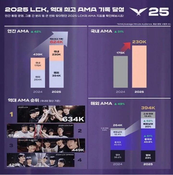 根据韩媒FOMOS的报道,2025年的LCK(韩国英雄联盟冠军联赛)因赛制改革取得了历史性的收视率增长。各项收视指标显示,LCK在平均每分钟观众数、国内及全球的视听表现均显著提升。