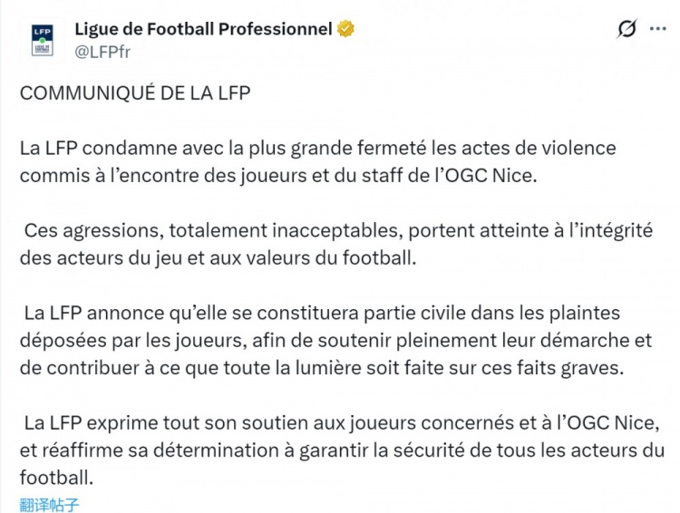法国职业足球联盟向受影响的球员及尼斯足球俱乐部表达了全面的支持,同时再次重申了保障足球界所有工作人员安全的承诺。