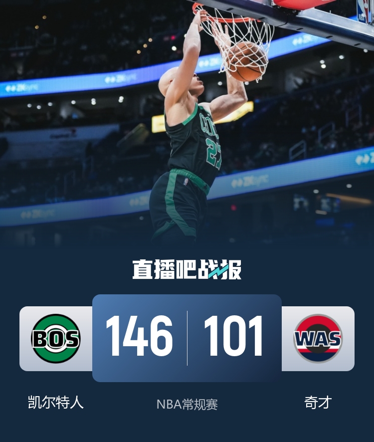 易边再战,凯尔特人继续掌控比赛节奏,怀特和沃尔什的出色表现令球队的领先优势不断扩大。当比赛进入末节时,奇才似乎已无力回天,连续的空砍让他们陷入困境,安芬尼·西蒙则如同天降神兵,单节命中四记三分球,帮助凯尔特人完成了21-5的攻击波。最终,凯尔特人以146-101的悬殊比分客场大胜奇才,顺利过关。