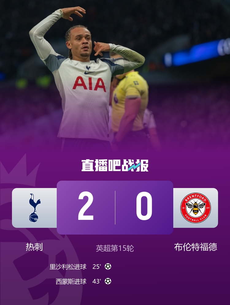 北京时间12月6日23:00,英超联赛第15轮的较量在新托特纳姆热刺球场上演,热刺迎来了布伦特福德的挑战。上半场比赛中,热刺展现出了强大的进攻实力,早早确立了领先优势。首先在第25分钟,西蒙斯从右路发起进攻,他精准的横传门前助攻里沙利松,后者毫不犹豫地插上,轻松将球送入网底,热刺由此取得了1-0的领先。