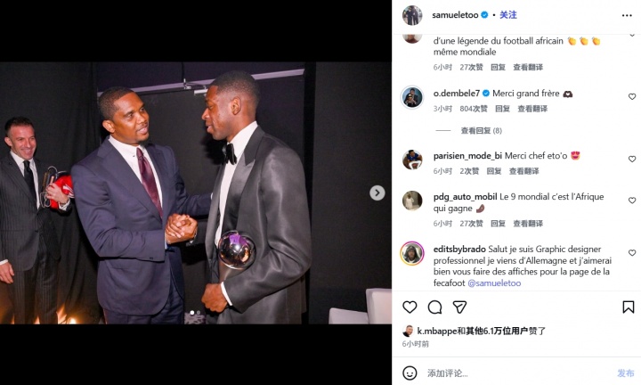 在这份祝贺的帖子下,登贝莱也亲自回应:“感谢你,老大埃托奥!”同时,年轻的姆巴佩也为之点赞,这象征着足球界对这位新王的认可。今晚的夜空更加明亮,属于登贝莱的星辰在召唤未来,而他的故事也将继续激励着下一代的追梦者。
