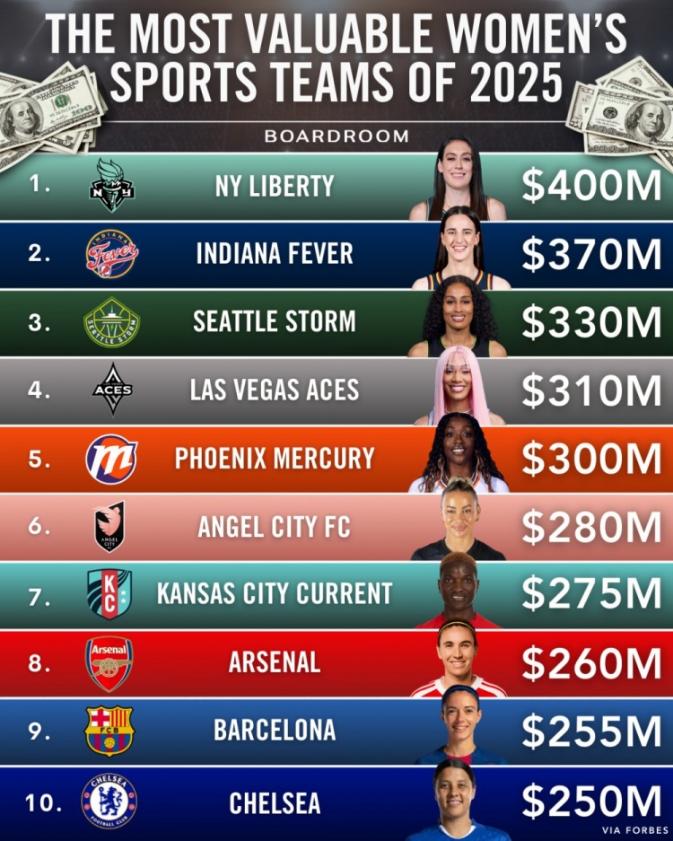12月21日消息,《福布斯》首次发布了“全球最具价值女子体育球队”排行榜,其中WNBA的纽约自由人以4亿美元的估值位居榜首,WNBA的球队包揽了前五名的席位。