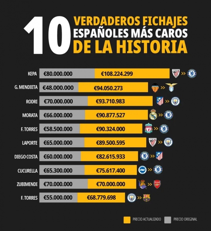 费尔南多·托雷斯,这位足坛传奇,他于2011年从利物浦转会到切尔西的5850万欧已经上涨至9030万欧。而拉波尔特的6500万欧转会费也在通胀的推波助澜下,上升到了8950万欧。同时,迭戈·科斯塔在2018年以6000万欧回归马竞,其价值现在也触及8260万欧的高峰。