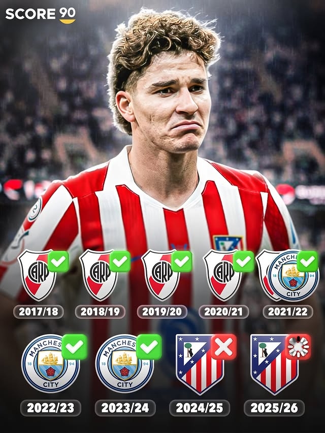 然而,自从在2024年夏天从曼城转会至马竞以来,阿尔瓦雷斯的运气似乎有些不济。他加盟马竞一个半赛季以来,球队无缘5项赛事的冠军,还未能收获个人的首个冠军。他在82场比赛中打进40球,并奉献了13次助攻,展现出不俗的个人能力,但球队成绩却始终未能如愿。