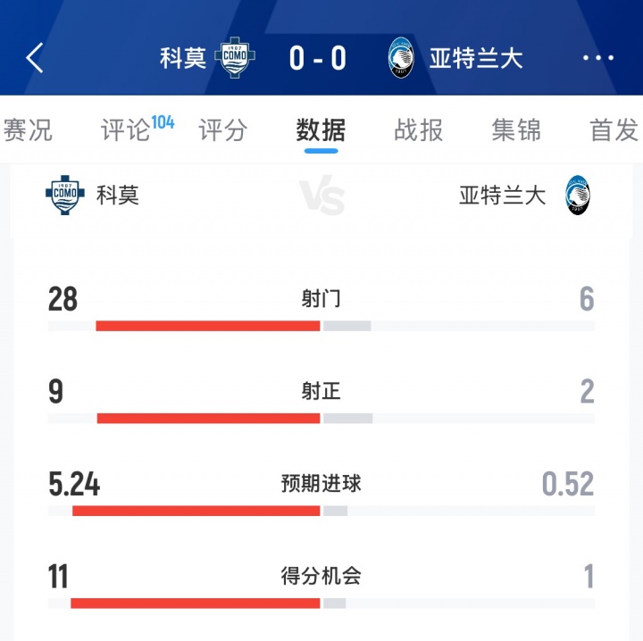 在一个寒冷的夜晚,意甲第23轮的比赛上演了一场让人心潮澎湃的角逐,科莫迎战亚特兰大。尽管主场作战,但科莫所展现出的攻势犹如一把锋利的刀刃,他们的预期进球高达5.24,而对手亚特兰大的仅为0.52,形成了鲜明的对比。然而,精彩的攻势并未能转化为实际的进球,最终双方以0-0握手言和。