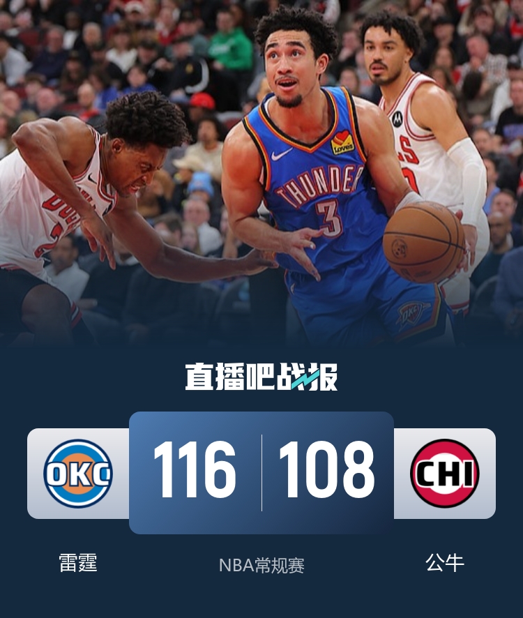 下半场开始后,公牛的进攻出现了问题,雷霆则抓住机会扩大领先优势,麦凯恩的外线投篮频频命中,第三节结束时,雷霆以87-76领先。进入最后一节,雷霆稳扎稳打,持续巩固他们的优势,比赛的结果逐渐明朗。最终,雷霆以116-108战胜了公牛,继续巩固他们在联盟中的地位。