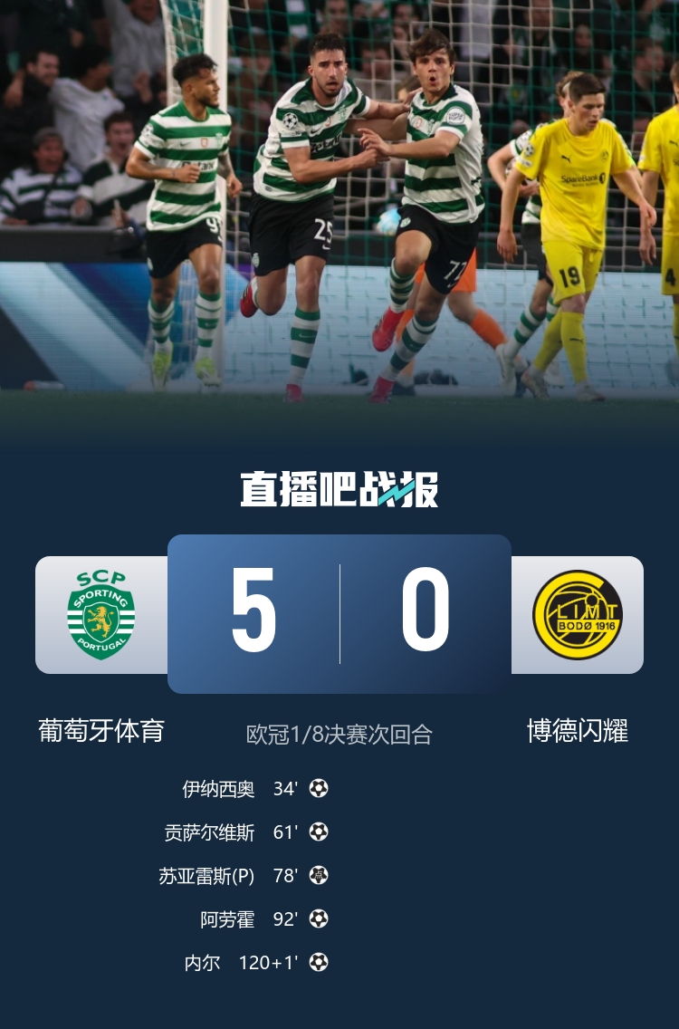 随着比赛的进行,两队进入了加时赛,葡萄牙体育的斗志似乎更加高昂。加时赛上半场,特林康他用精准的助攻完成了精彩的配合,马克西米利亚诺·阿劳霍在禁区内迎球怒射得手,比分反超为4-3。而就在补时阶段,内尔为球队锁定胜局,最终以5-0的悬殊比分战胜了博德闪耀,实现了两回合总比分5-3的惊人逆转,成功晋级欧冠八强。