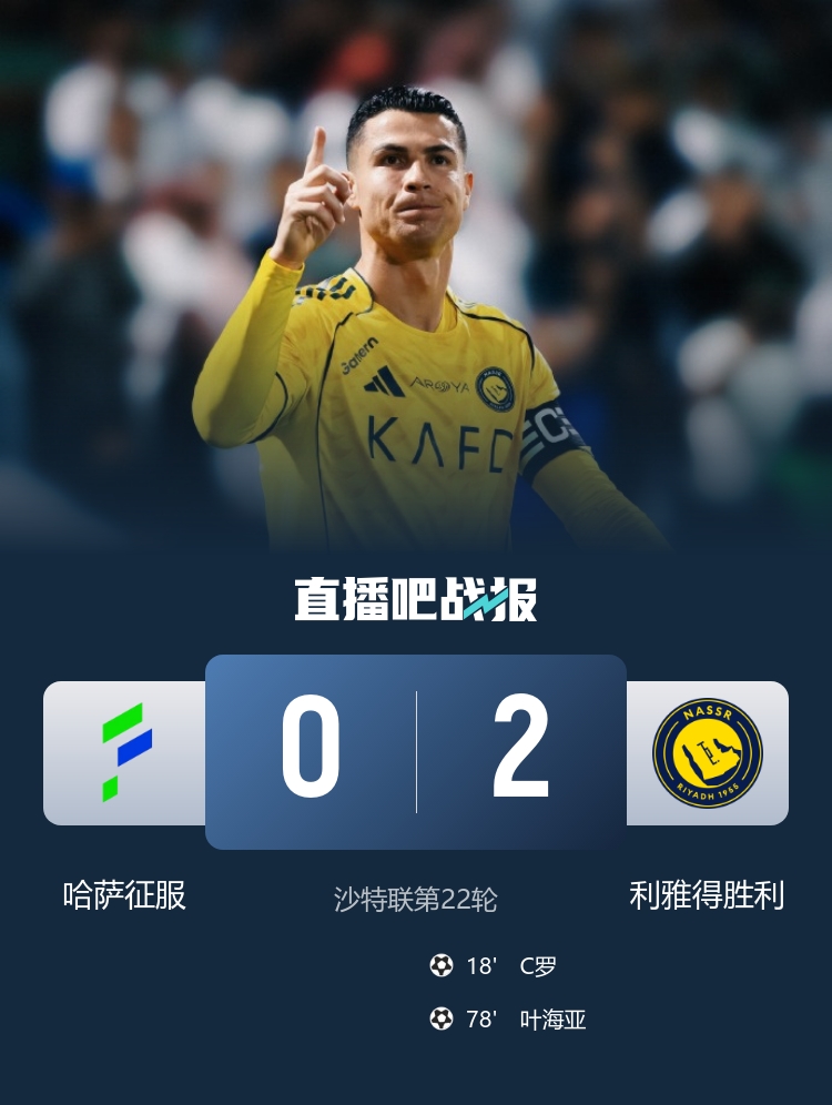 2月15日讯 北京时间2月15日凌晨1时30分,2025-26赛季沙特联第22轮在扎拉维体育场展开较量,利雅得胜利面对哈萨征服。尽管C罗因罢赛风波回归,作为41岁的老将,他在本场比赛中依旧展现出不凡的竞技状态,首战便迎来进球,成为职业生涯的第962球,助力球队以2-0战胜对手,继续保持着联赛的连胜势头。