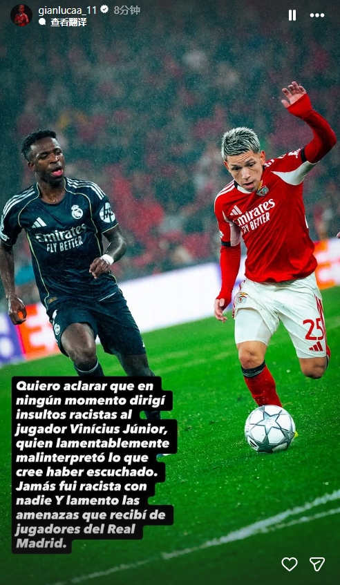 在最近进行的欧冠淘汰赛附加赛首回合中,本菲卡在主场以0-1不敌皇家马德里。比赛途中,发生了一起关于种族歧视的争议事件,涉及到本菲卡球员普雷斯蒂亚尼和皇马的维尼修斯。对此,普雷斯蒂亚尼发表了一份声明,以澄清自己的立场。