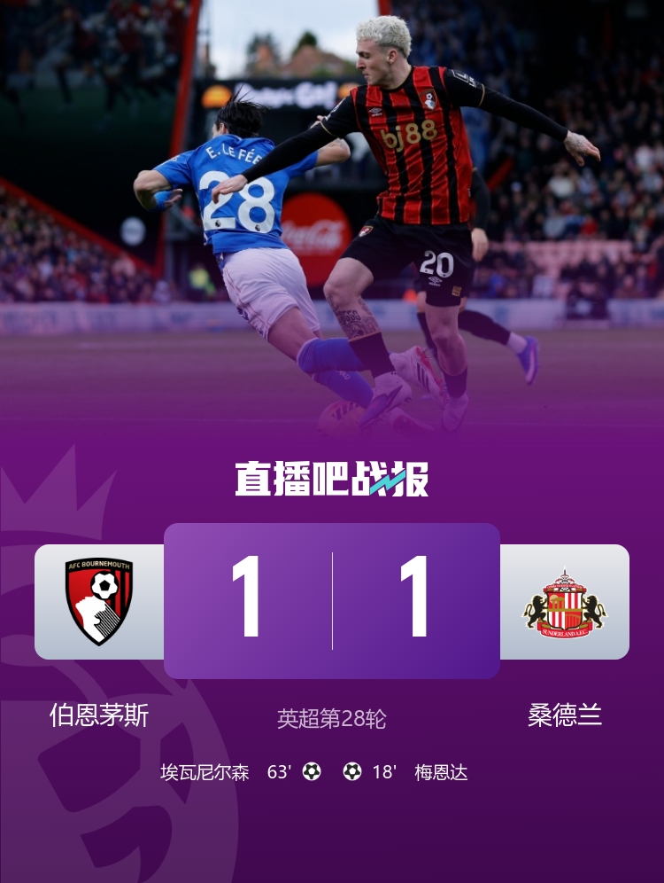 在2月28日的英超联赛中,伯恩茅斯在活力球场迎战桑德兰,双方经过90分钟的激烈争夺,最终以1-1握手言和。此役过后,伯恩茅斯以39分位居积分榜第8,而桑德兰则以37分排在第11。