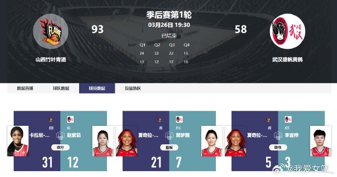 在昨晚的WCBA季后赛中,山西竹叶青酒队主场以93-58击败武汉盛帆黄鹤队,顺利取得开门红。