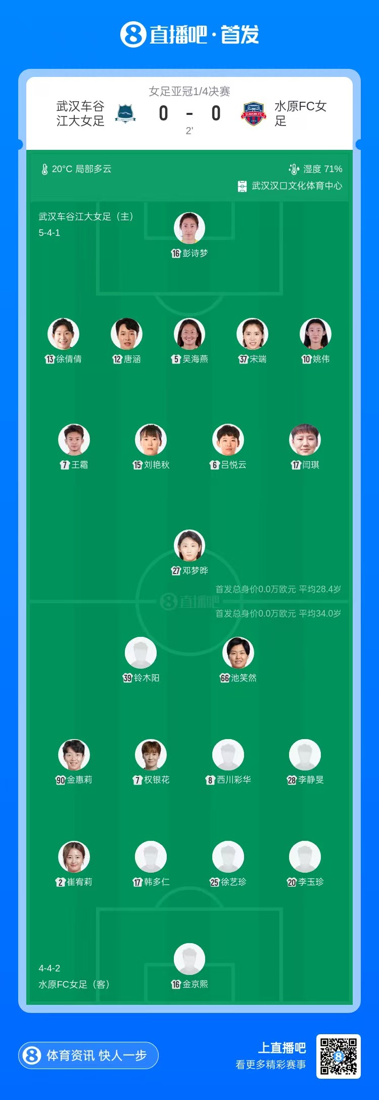 在今晚的女足亚冠1/4决赛中,武汉车谷江大女足将迎来水原FC女足的挑战。这场比赛的看点不仅仅是球队的阵容,仿佛连伤病也决定了要来凑热闹——陈晨因伤缺阵,似乎在赛前就给了武汉队不少困扰。