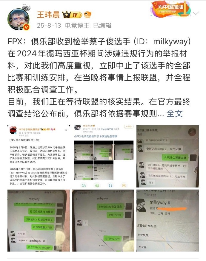 此外,媒体人王玮晨对此事件进行了梳理,他回顾了Milkyway的时间线:去年8月13日,FPX战队发布公告,称收到关于Milkyway的举报,因此决定暂时停止他的比赛和训练。翌日,Milkyway则表示自己所称的聊天记录纯属伪造,并已向警方报案。随后,爆料者删除了自己的账号并消失无踪,而FPX战队还是将Milkyway从大名单中移除。
