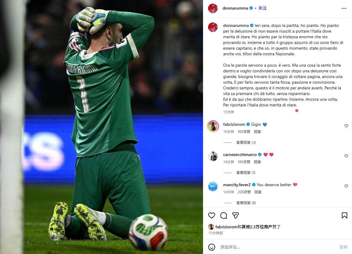 04月01日讯 在世预赛欧洲区附加赛的决赛中,意大利通过点球大战以失败告终,遭遇波黑,导致他们三届世界杯的征程再次止步。赛后,至今未能参与世界杯的队长多纳鲁马在社交媒体上发表了感慨。