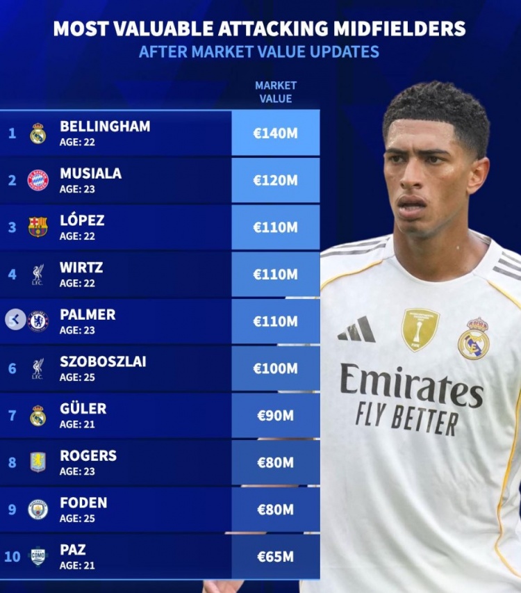 紧接着,巴萨的小将费尔明和利物浦的维尔茨并列,身价均为1.1亿。费尔明在球场上的灵活性和创造力,让人们对未来寄予厚望;而维尔茨同样展现出令人赞叹的技术。此外,切尔西的帕尔默也以1.1亿的身价,与他们并肩而立,展现了新一代球员的无限可能。