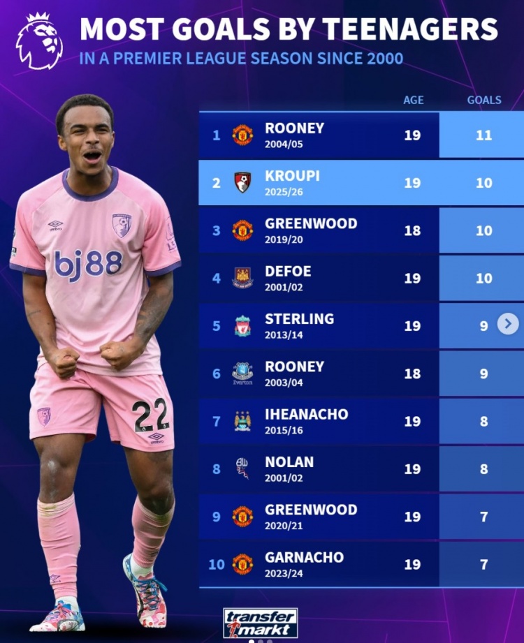 追溯这项纪录,鲁尼在04-05赛季时以19岁的年龄,仅用一季就收获11球,那份锋芒依旧历历在目。如今,克鲁皮的表现令人鼓舞,紧随其后,正处于历史榜单的第二位。如果他在接下来的比赛中再添进球,打破鲁尼的纪录将成为他职业生涯一大里程碑。